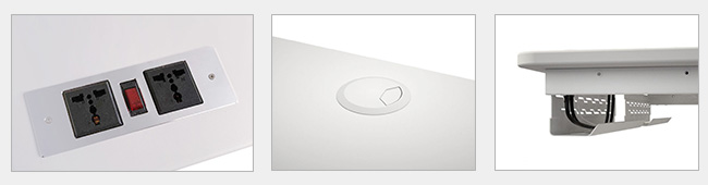 - Вбудована розетка живлення, кабельна втулка та лотки для укладання кабелів під столом. Зручні інструменти для організації робочого місця
