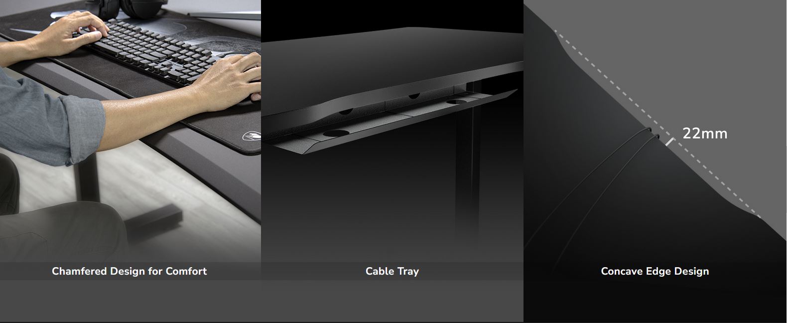 Завдяки великій ігровій поверхні, шириною 150 см, стіл COUGAR FOBOS 150 пропонує достатньо місця для ігрових моніторів, клавіатур та іншого необхідного обладнання. Продумані конструктивні особливості, такі як вигнуті краї та закруглені кути, підвищують комфорт та ергономічність