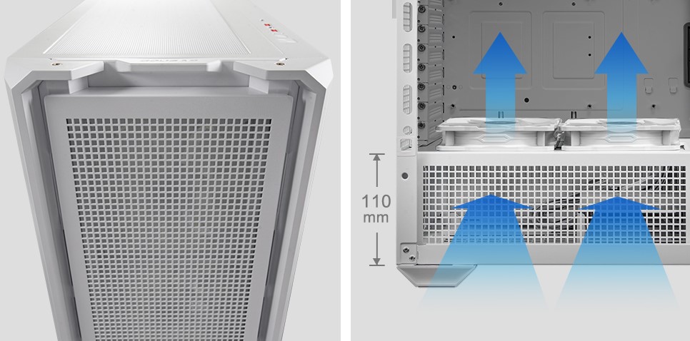 Попрощайтеся з гарячим обладнанням: MX600 RGB захищений від підвищення температури завдяки повній всеспрямованій вентиляції. Перфорована передня сітка і збільшена висота відсіку для блока живлення з повітрозабірними отворами сприяє ефективній прохідності повітря.