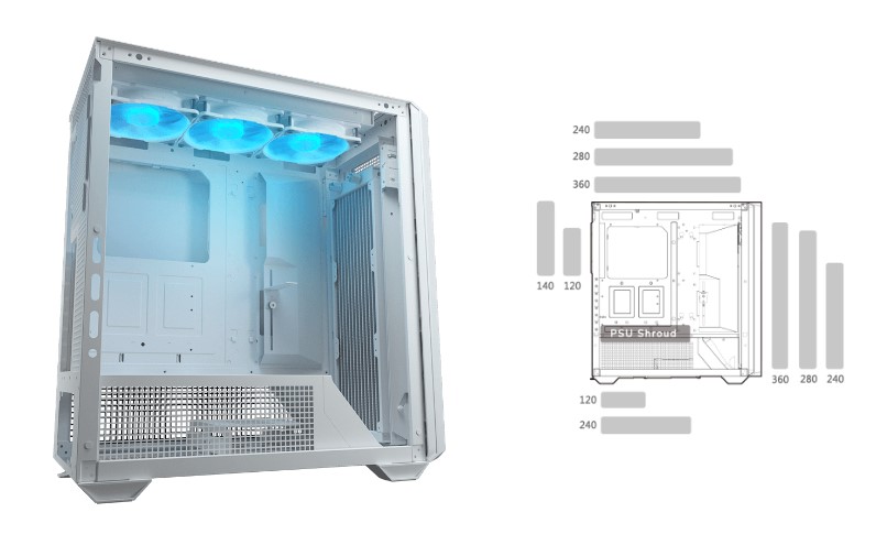 MX600 RGB підтримує варіанти подвійного 360-мм водяного охолодження на верхній і передній панелях.