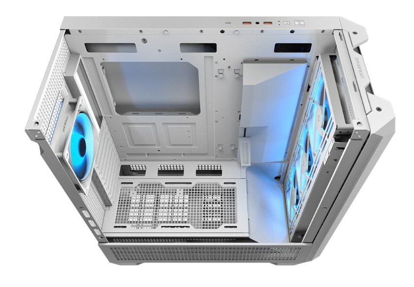 Конструкція планки передніх вентиляторів спрощує збірку, даючи змогу встановлювати передні вентилятори або водяне охолодження без зняття передньої панелі. Повністю знімна верхня кришка забезпечує достатньо місця для компонентів системи, а легкознімна кришка відсіку блока живлення дає змогу без проблем встановлювати або замінювати блок живлення. Вентилятори або 360-мм систему водяного охолодження можна надійно встановити безпосередньо на верхню кришку.
