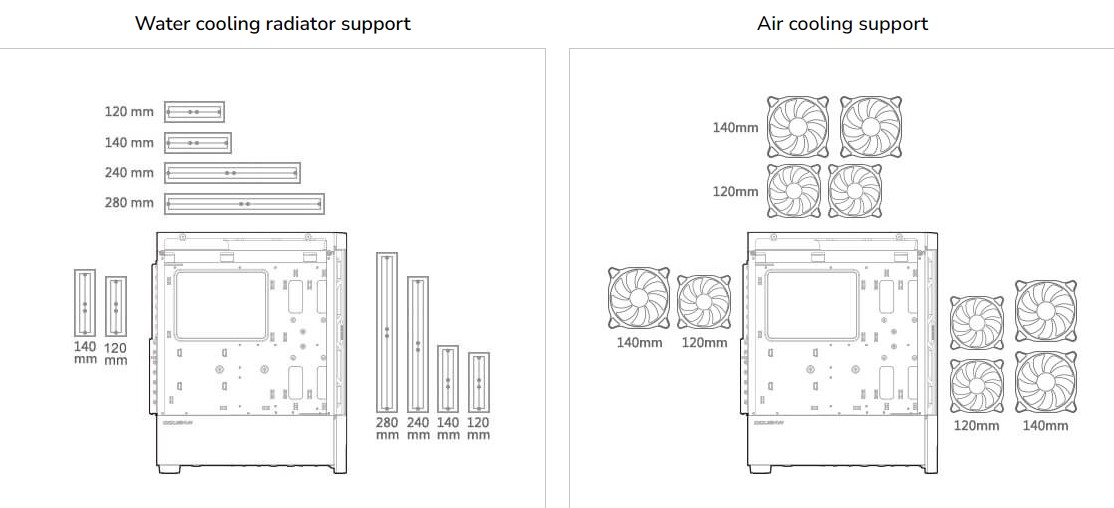 - Спереду: 280 мм / 240 мм / 140 мм / 120 мм (можливо встановити тільки 1х 280-мм радіатор - або спереду або зверху)