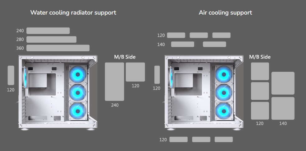 FV150 RGB має місткість 3x 120 мм або 2x 140 мм зверху та знизу, 3x 120 мм вентилятора збоку та 1x 120 мм ззаду (бокові та задні вентилятори ARGB передвстановлені). Підтримка водяного охолодження становить максимум 360 мм зверху та 240 мм збоку.
