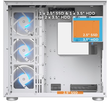 FV150 RGB може вмістити до 1 HDD розміром 3.5 дюйма та 2 SSD розміром 2.5 дюйма або 1 SSD 2.5 дюйма та 2 HDD 3.5 дюйма.
