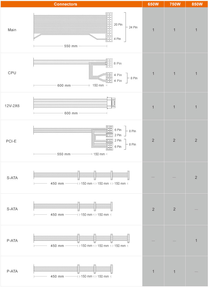 Серія COUGAR GST підтримує новітню специфікацію PCIe 5.1: її потужна та стабільна продуктивність відповідає потребам графічних процесорів наступного покоління. Оснащений власним модульним роз'ємом PCIe 12V-2X6, довжина 600 мм забезпечує достатній запас для зниження ризику неправильного з'єднання під час встановлення ПК без необхідності використання адаптера з контактами 6+2.