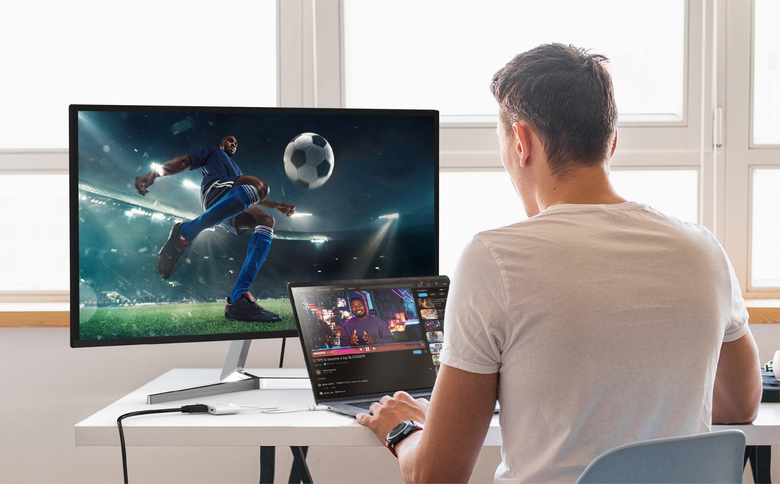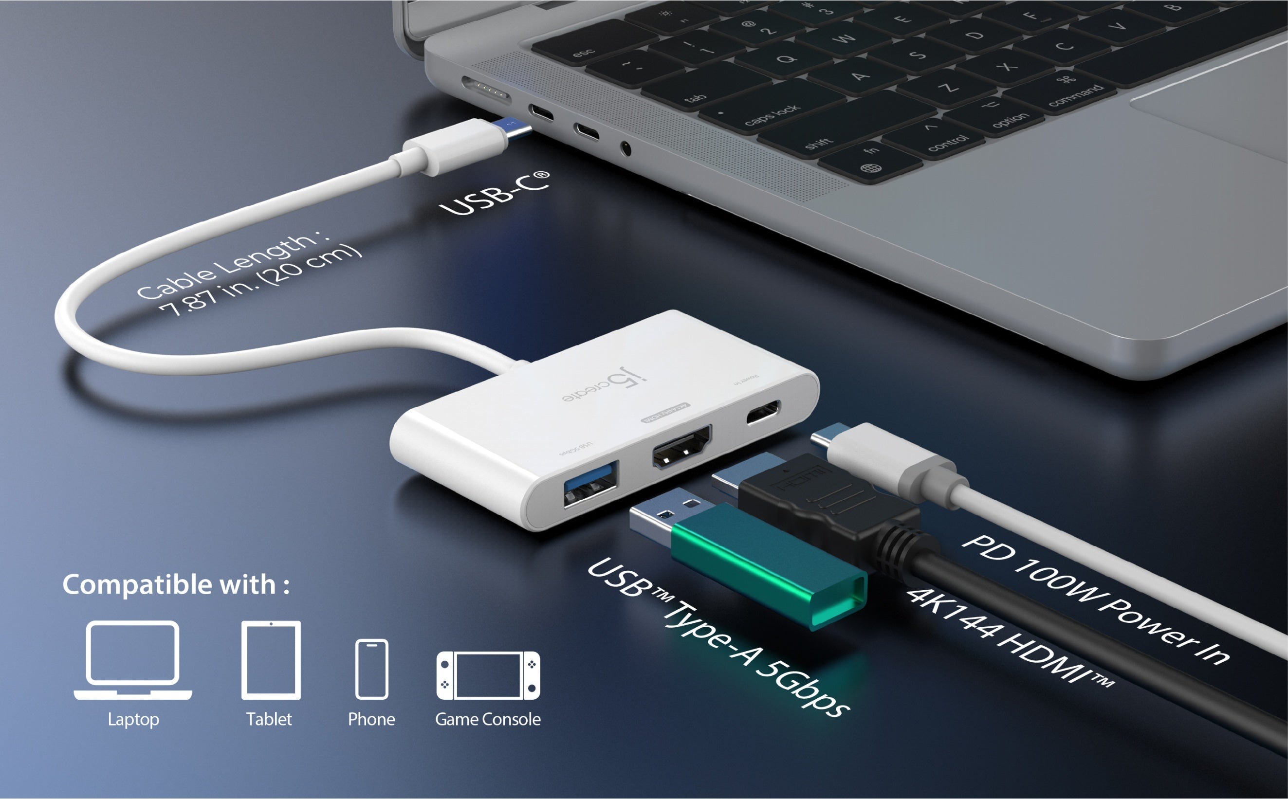 Цей адаптер дозволяє підключити до вашого пристрою дисплей, наприклад монітор або телевізор, і підтримує роздільну здатність до 4K 144 Гц. Також має порт USB™ Type-A 5 Гбіт/с і порт USB-C® Power Delivery, який можна використовувати для заряджання ноутбука, коли підключено адаптер живлення USB-C®.