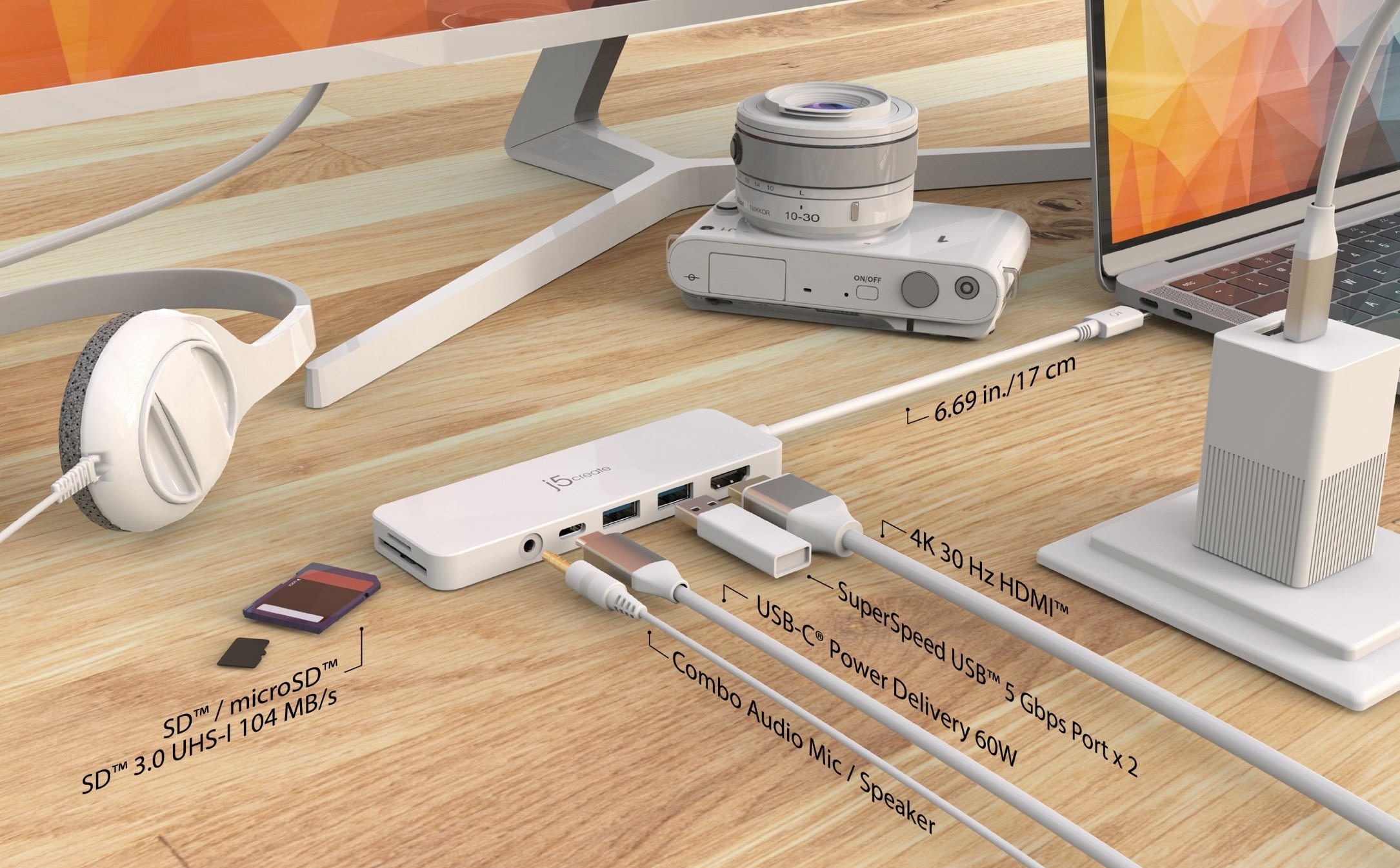 Оснащений портом зарядки USB-C® Power Delivery 3.0. Забезпечує зарядку потужністю до 60 Вт при підключенні до адаптера живлення USB-C®. Хаб також забезпечує прямий доступ до карт пам'яті SD™ і microSD™. Комбінований аудіо роз'єм дозволяє підключити навушники або колонки.