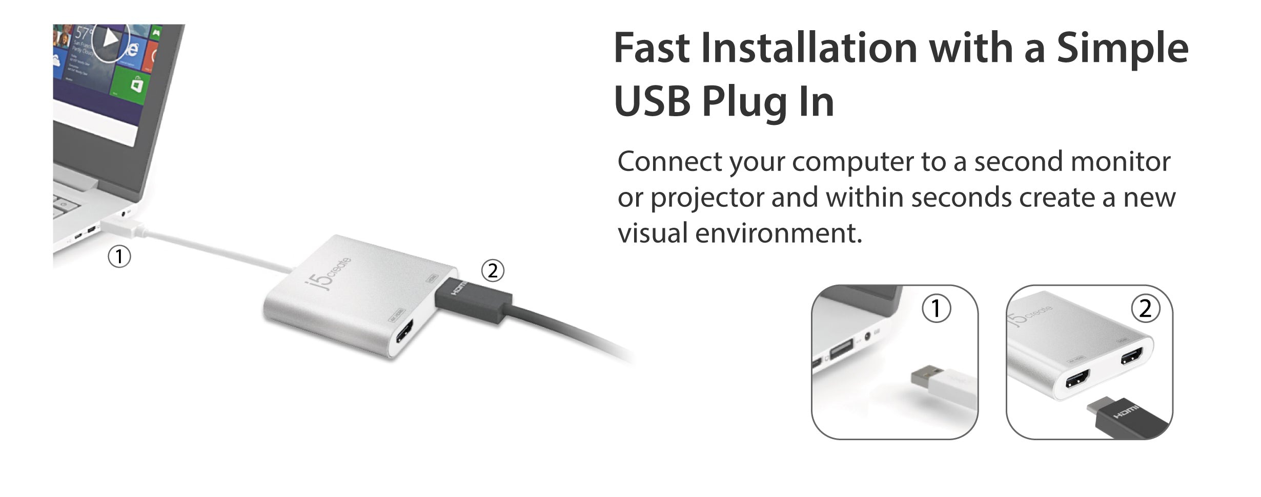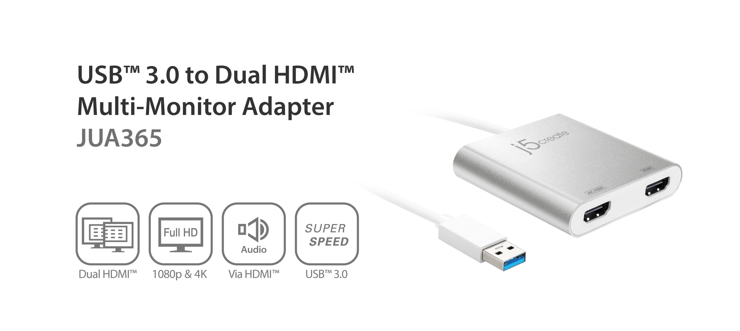 Адаптер JUA365 USB™ 3.0 до Dual HDMI™ Multi-Monitor Adapter виконує функцію зовнішньої відеокарти для комп'ютерів MacBook® або Windows®. Він дозволяє підключити два додаткові дисплеї через порт USB™ 3.0, підвищуючи продуктивність роботи за рахунок збільшення робочої області екрана. Компанія j5create розробила цей компактний пристрій для вимогливих користувачів, які цінують як функціональність, так і елегантний дизайн. Один з портів HDMI™ може виводити зображення з роздільною здатністю до 4K, а інший — до 2048 x 1152. З адаптером USB 3.0 до Dual HDMI Multi-Monitor Adapter вам достатньо завантажити драйвери, підключити адаптер до порту USB, а потім підключити кабель HDMI монітора до адаптера — і все готово.
