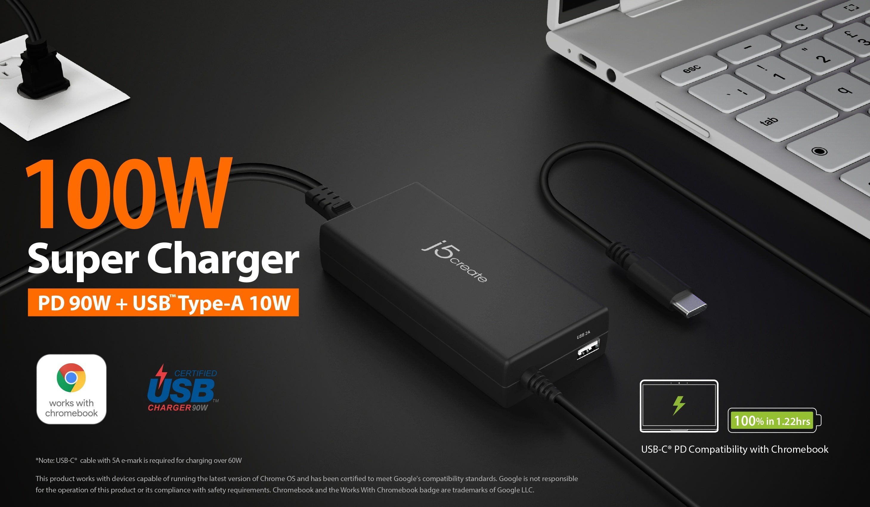 Ідеально підходить для Chromebook і MacBook® – цей суперзарядний пристрій потужністю 100 Вт був протестований і сертифікований інженерами Google® для роботи з поточними та майбутніми пристроями Chromebook. Кабель USB-C® може забезпечувати потужність до 90 Вт, а порт USB™ Type-A – до 10 Вт, що дозволяє швидко заряджати два пристрої одночасно. Адаптер живлення підтримує захист від перенапруги, перезарядки, перевантаження та перегріву, щоб запобігти пошкодженню підключених пристроїв і забезпечити безпечну зарядку.