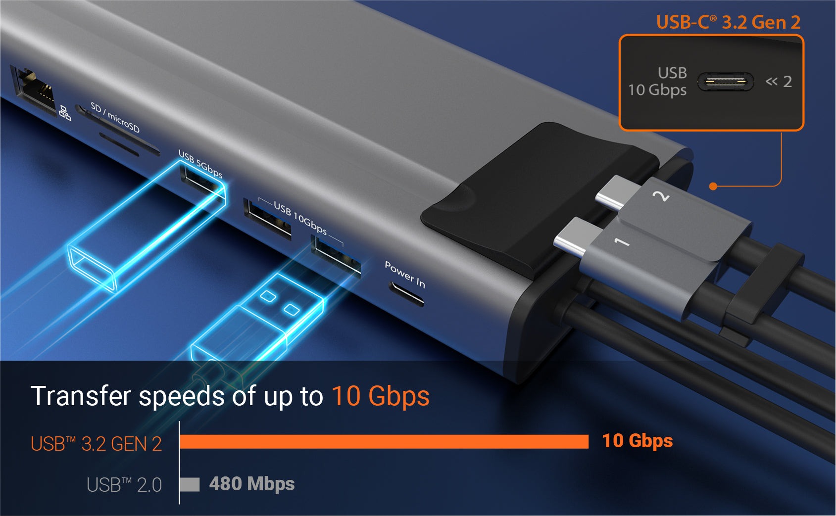 Підвищіть свою продуктивність за допомогою док-станції M.2 NVMe® USB-C® Gen 2, яка перетворює ваш ноутбук, сумісний з Thunderbolt™ 3 або USB-C®, на подвійну робочу станцію 4K із швидкістю до 10 Гбіт/с. Ця високопродуктивна док-станція оснащена слотом M.2 NVMe®/SATA PCIe® SSD для розширення внутрішнього простору для зберігання даних, трьома портами SuperSpeed USB™ 10 Гбіт/с (один USB-C® і два USB™ Type-A), портом Gigabit Ethernet, зчитувачем/записувачем карт пам'яті SD™ і microSD™, а також портом USB™ Type-A 5 Гбіт/с.