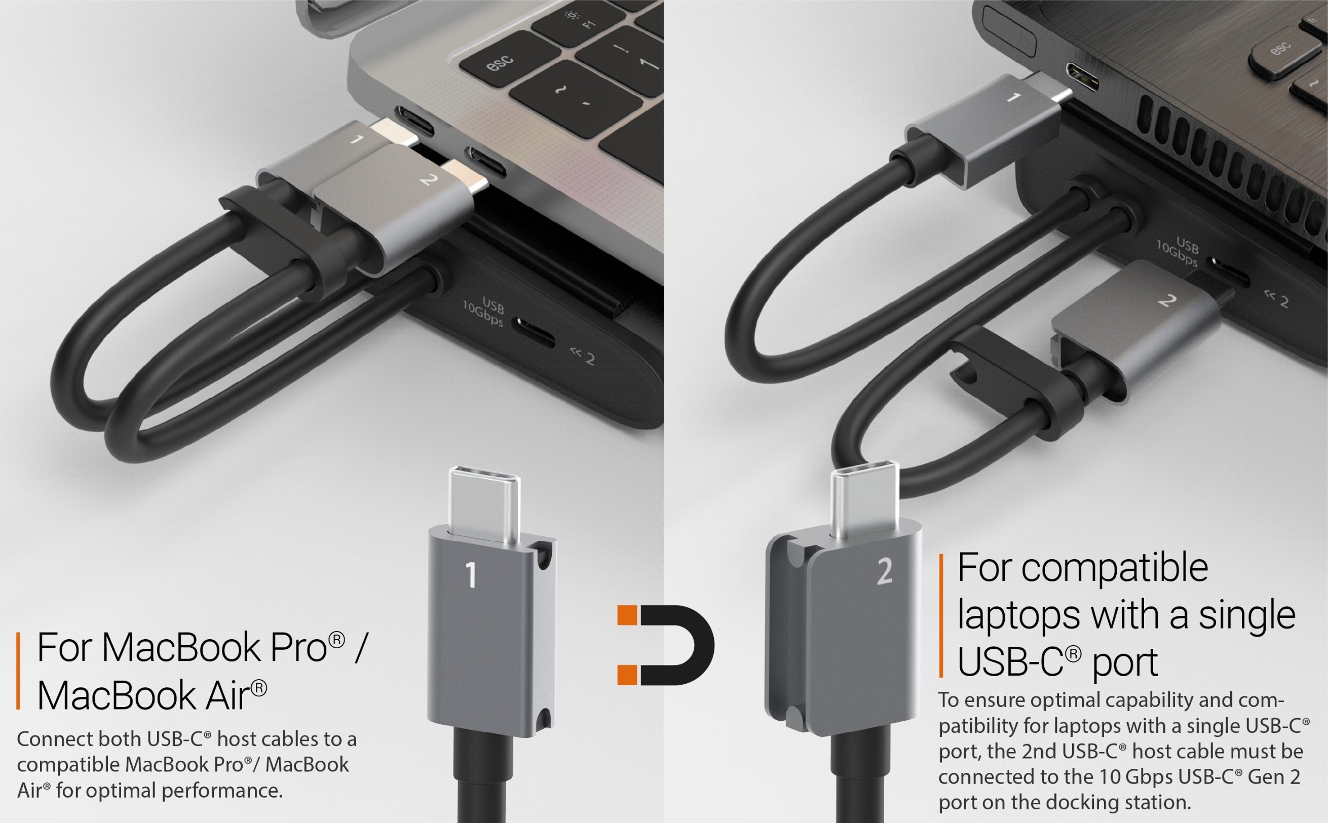 - Для забезпечення оптимальної продуктивності та сумісності ноутбуків з одним портом USB-C® другий кабель USB-C® host необхідно підключити до порту USB-C® Gen 2 10 Гбіт/с на док-станції.